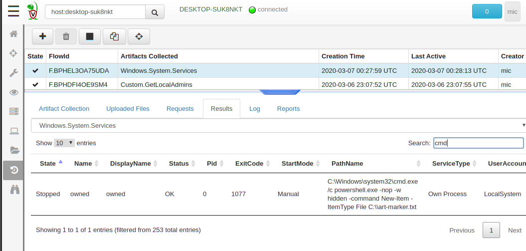 Now when collecting the artifact, we can see which machines had the malicious service installed, and how the removal went. We can then collect the Windows.System.Services artifact again to check that services were correctly removed.