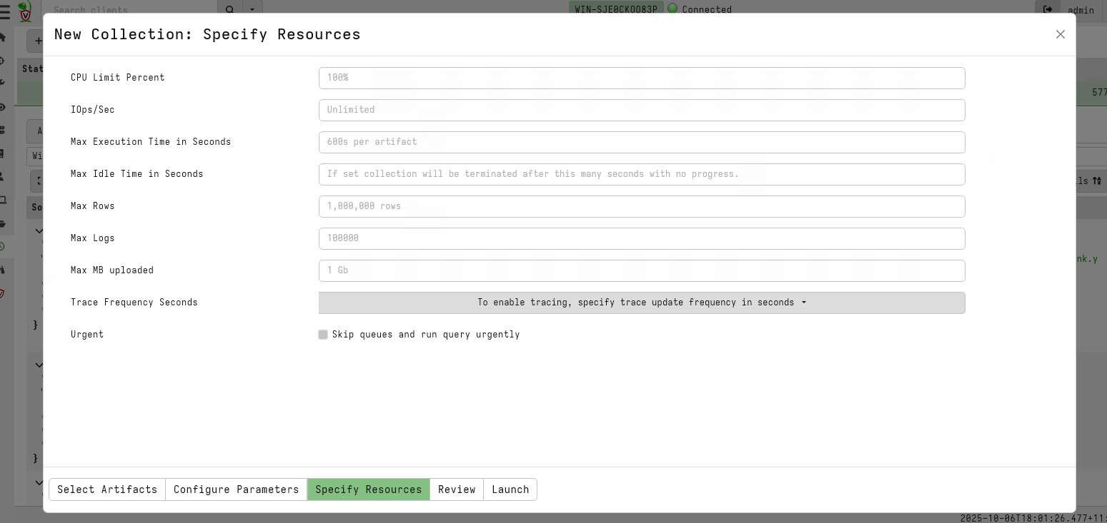 Velociraptor contains a number of mechanism to limit resource usage, as a “fail safe” and to prevent accidentally overloading the endpoint. You can read more details on Resource Limits here , but for now notice that Velociraptor’s default resources are pretty reasonable