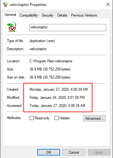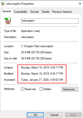 For the next exercise we will stomp over some times. Use the following powershell to stomp over Velociraptor.exe’s timestamps.