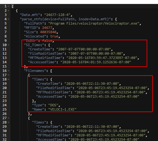 $STANDARD_INFORMATION and $FILENAME streams) and MFT ID.
