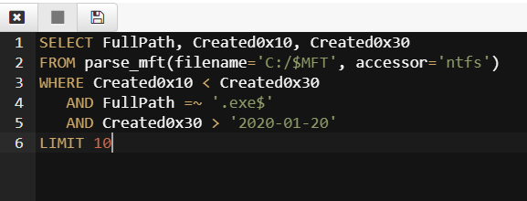 SELECT * FROM parse_mft(filename="C:/$MFT", accessor="ntfs")