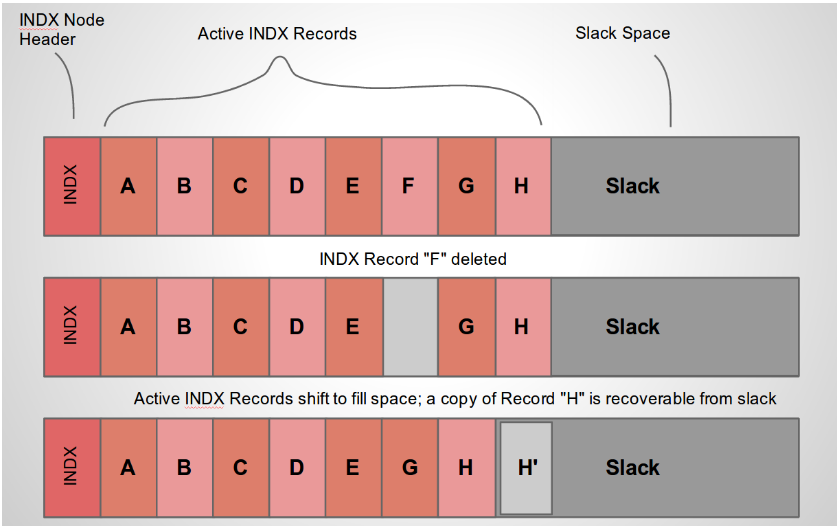Since INDX streams are a B+ tree when a record is deleted, the tree will be reordered. Sometimes this leaves old entries in the slack space. INDX stream is allocated in 4096 byte blocks which leaves a lot of slack space to potentially hold residual data.