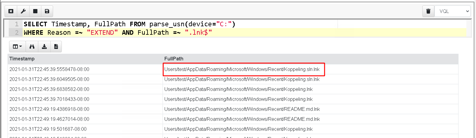Velociraptor can parse each entry in the USN journal directly on the endpoint. This allows for queries to target specific files or times of interest on the endpoint.