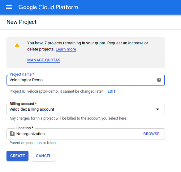 For this example I will created a new project called velociraptor-demo: