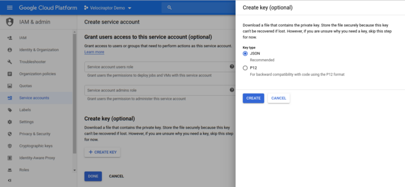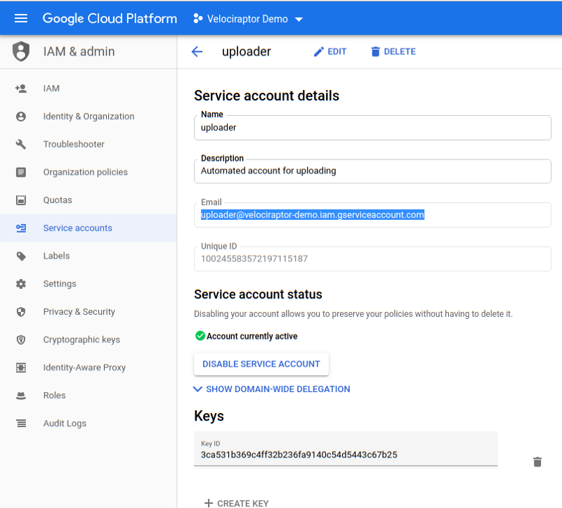 The key allows Velociraptor to act as the service account on this cloud